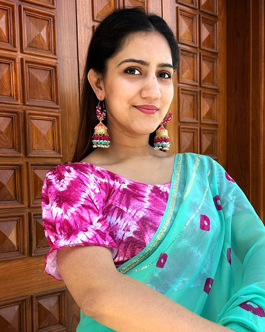 Bandhan Pink Glitter Blouse by Advi with Sleek Pleats and Tie-Dye Print