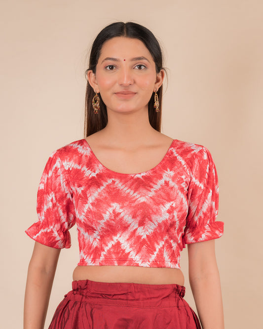 Bandhan Red Shibori Tie-Dye Blouse with Sleek Pleats and Glitter by Advi