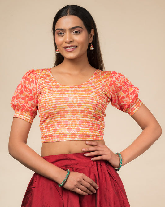Kohima Ikat Multicolour Printed Blouse | Readymade Puff Sleeve Saree Fit