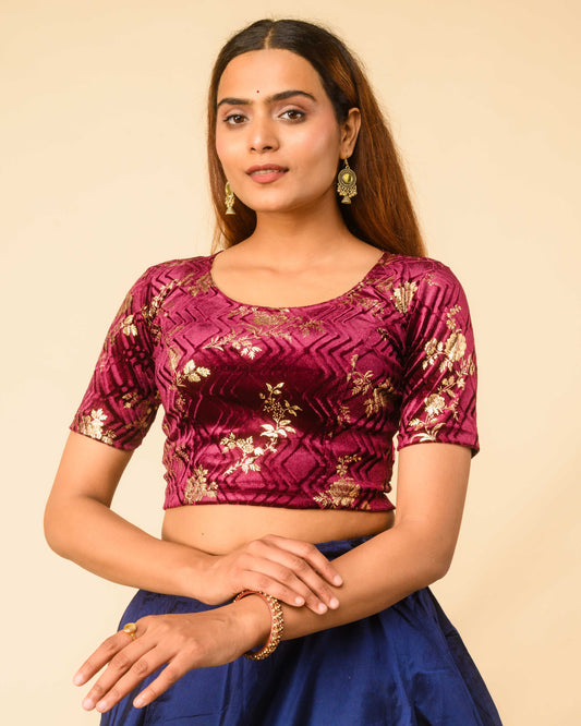 Keri Wine Metallic Velvet Floral Stretchable Saree Blouse – Advi