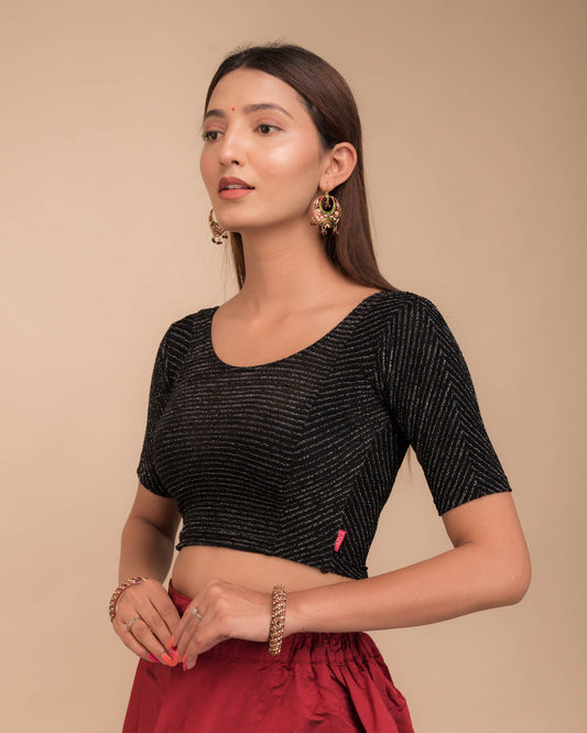 Lata Velvet Zari Black Stretchy Metallic Stripes Round Neck Saree Blouse