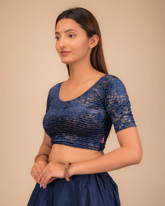 Vasu Velvet Gold Foil Stripes Navy Elbow Sleeve | Ready-To-Wear Blouse