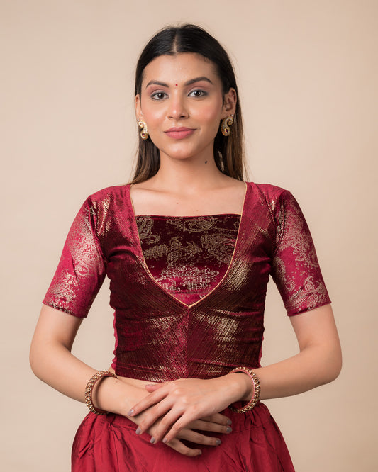 Ambar Maroon Velvet Readymade Blouse – Choli Jacket Design With Elbow Sleeves