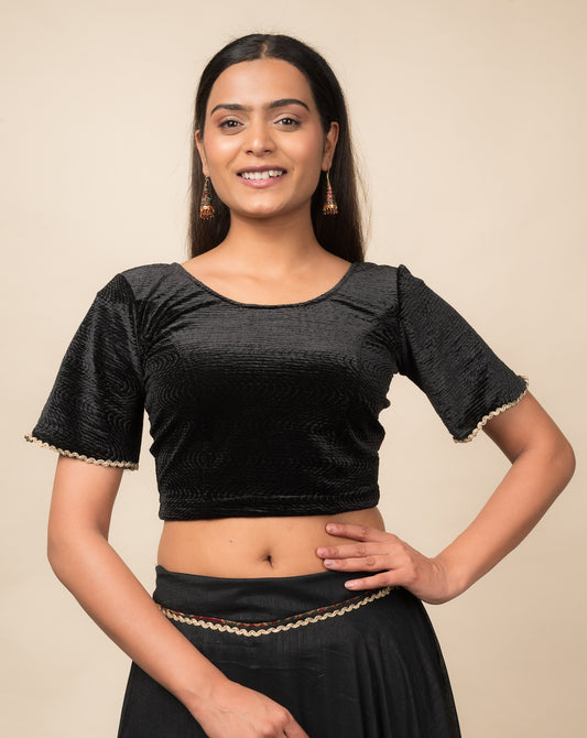 Kisna Black Velvet Bell Sleeve Blouse with Gold Lace Finish – Stretchable Saree Blouse