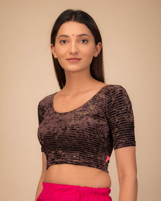 Vasu Velvet Coffee Gold Foil Stretchable V Shaped Neck Everyday Comfort Blouse