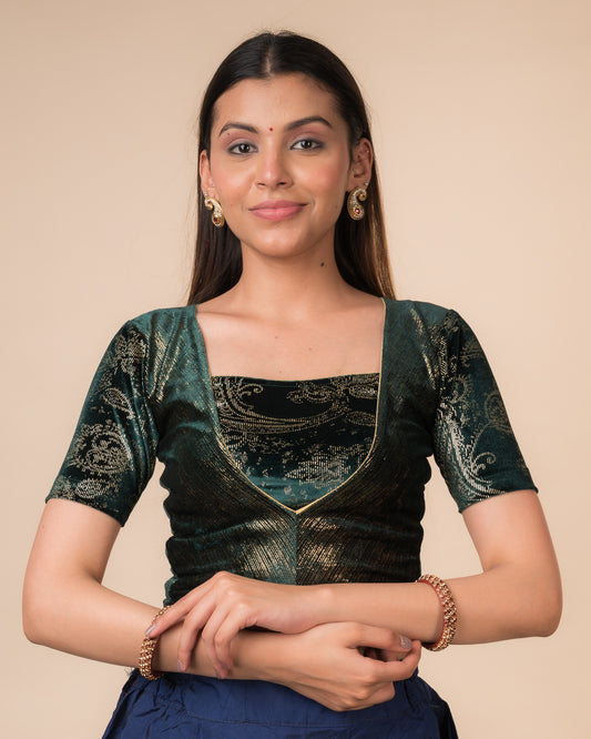 Ambar Bottle Green Velvet Choli Style Readymade Blouse – Golden Work Party & Wedding Wear