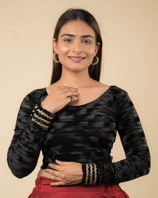 Kavya Black Velvet Long Sleeve Blouse with Zari Cuff Lace – Readymade Blouse