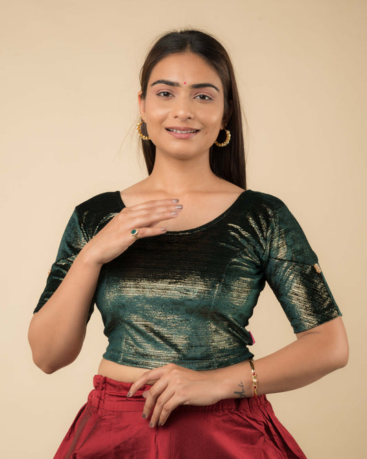 Sitara Bottle Green Puff Sleeve Blouse with Gold Foil Stretch Fit by Advi