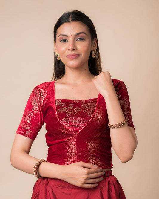 Ambar Red Gold Stripped Velvet Stretchable Blouse – Shimmer Finish Designer Blouse