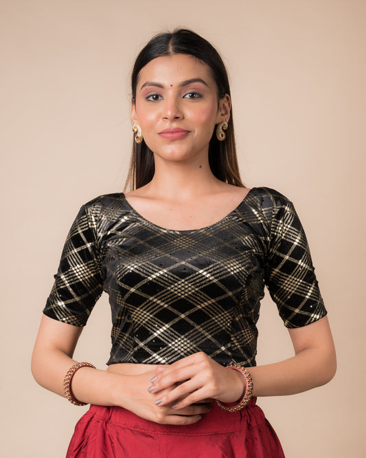 Beri Black Sequin Burberry Checked Blouse with Festive Round Neck Advi