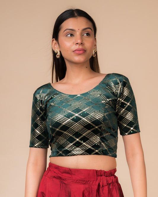 Beri Bottle Green Sequin Burberry Checks Blouse with Elbow Sleeves by Advi