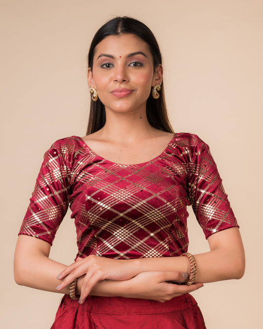 Beri Maroon Burberry Checks Sequin Festive Slip On Round Neck Blouse Advi