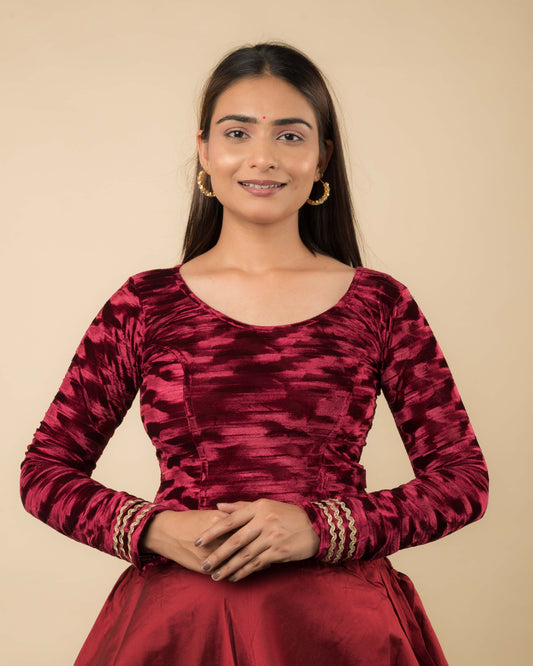 Kavya Velvet Wine Long Sleeve Blouse with Zari Laced Cuffs – Elegant Readymade Blouse