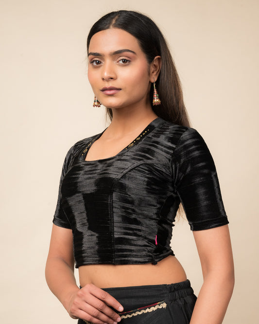 Asha Textured Black Velvet With Embellished Square Collar Neckline Stretchable Blouse