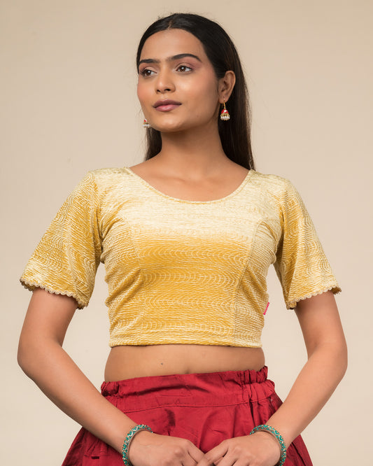 Kisna Gold Velvet Elbow Sleeve Blouse with Round Neck & Lace Detailing – Readymade