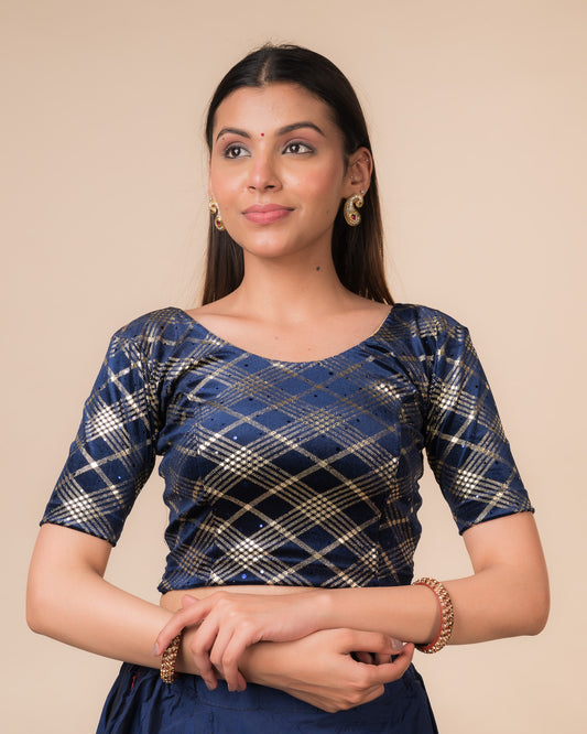 Beri Navy Burberry Checks Sequin Stretchable Elbow Sleeve Blouse Advi