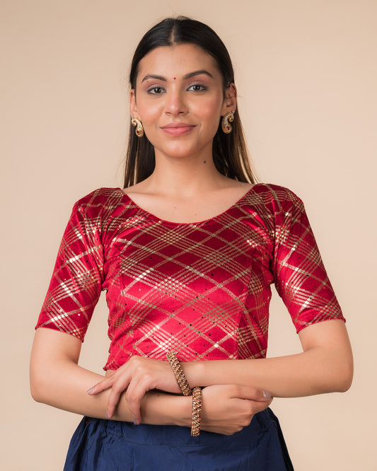 Beri Red Sequin Burberry Checked Stretchable Blouse with Elbow Sleeves Advi
