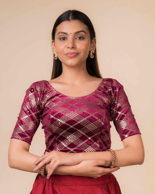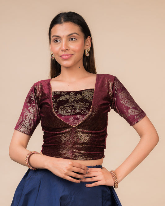 Ambar Velvet Wine Embellished Choli Style Readymade Saree Blouse – Elbow Sleeves