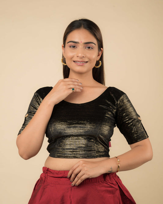 Asha Velvet Gold Elbow Sleeve Blouse with Hotfix Stones & Collar – Readymade Blouse