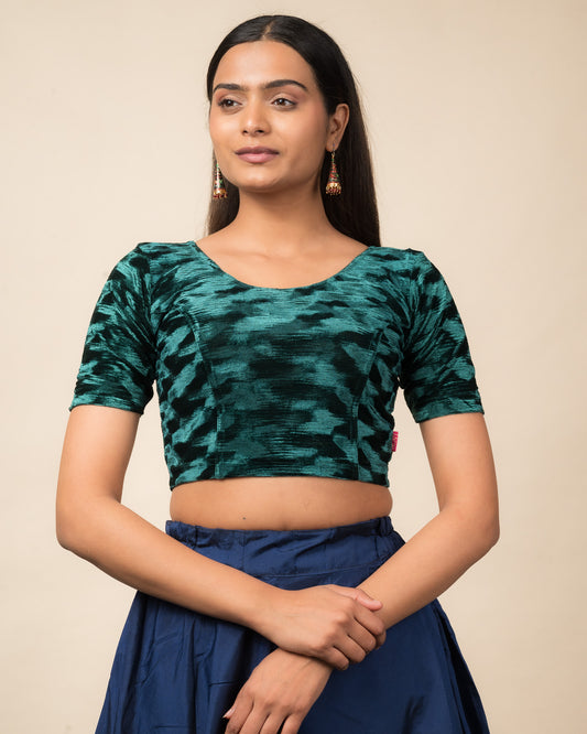 Arkha Rama Green Velvet Geometric Printed Saree Blouse – Round Neck Stretch Fit