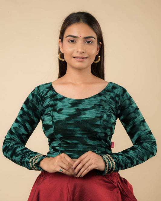 Kavya Velvet Bottle Green Long Sleeve Blouse with Chudi Zari Cuffs – Readymade Blouse