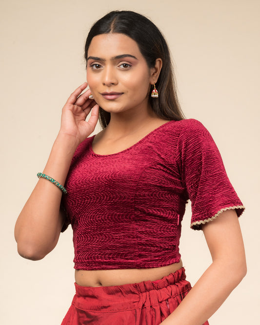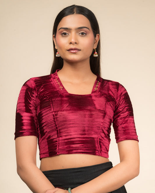 Asha Velvet Maroon Collar Blouse with Beads, Stones & Elbow Sleeves – Stretchable Blouse