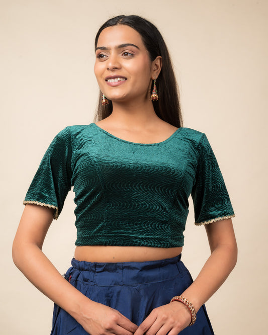 Kisna Bottle Green Velvet Bell Sleeve Blouse with Gold Trim – Stretchable Blouse