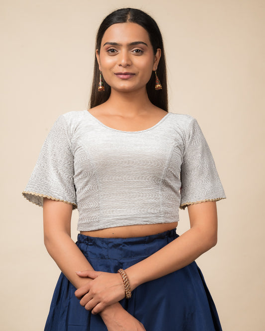 Kisna Gray Velvet Bell Sleeve Blouse with Lace Detail – Readymade Traditional Wear Blouse