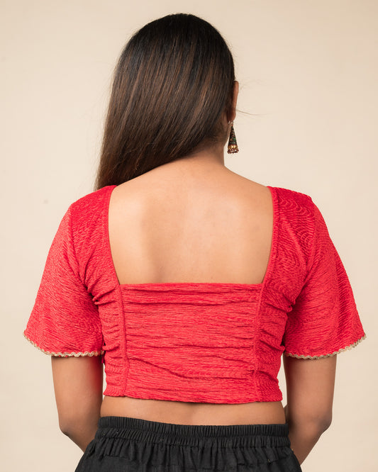 Kisna Red Velvet Bell Sleeve Blouse with Gold Lace Border – Stretchable Saree Blouse