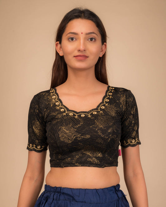 Kangoori Gold Zari Embroidery Black Designer Neck Blouse | Party Ready