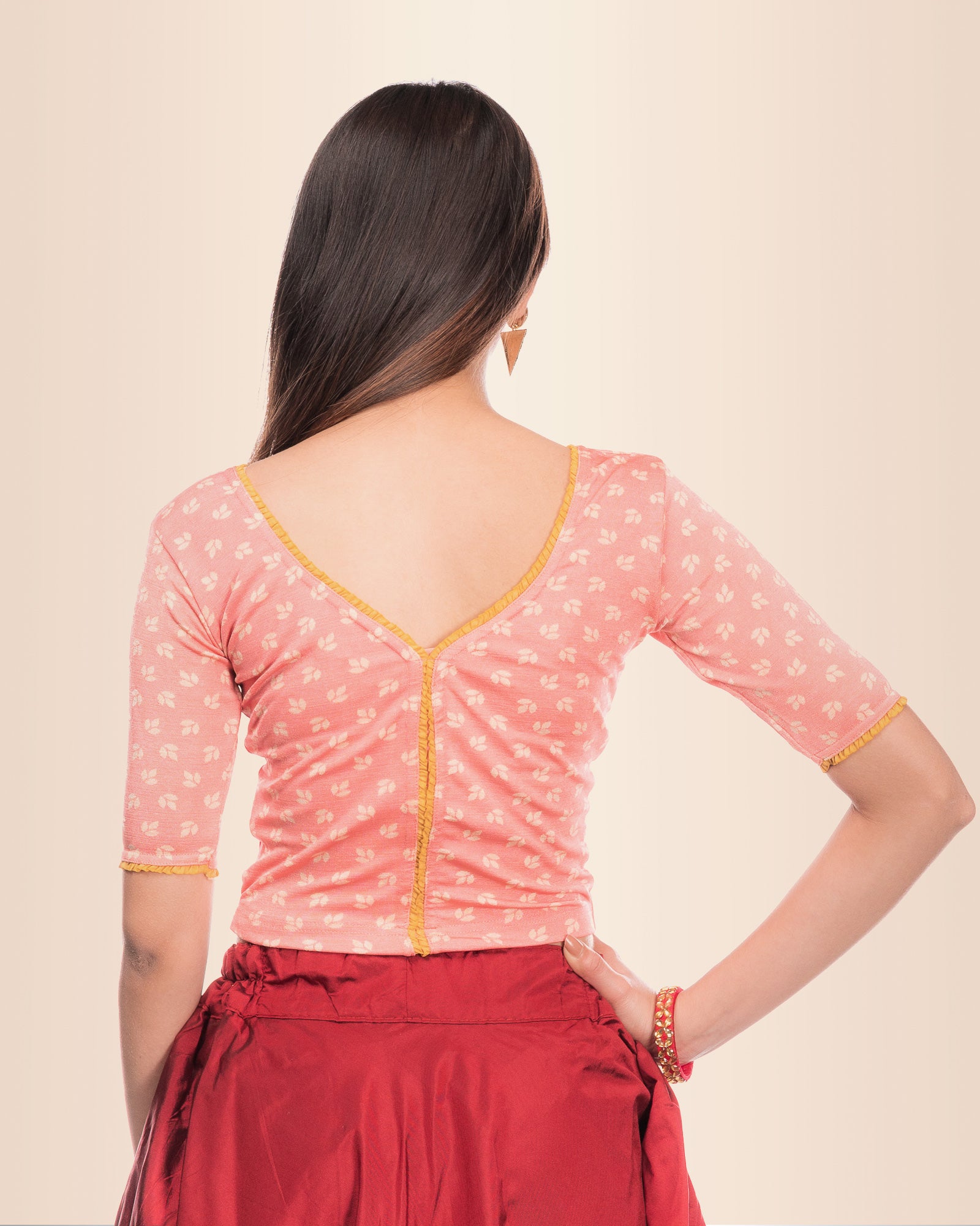 Kalee Peach Jacquard Blouse with Frill Neck and Boat Fit Advi