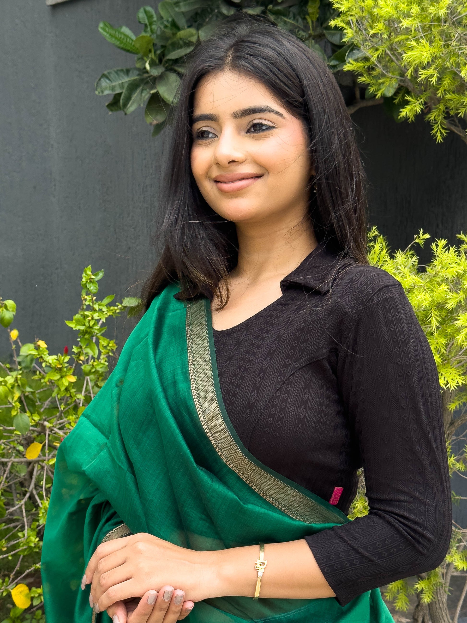 Advi’s Rakhi Ikat Collar Blouse infuses ethnic sophistication with artisanal charm. Crafted from stretchable ikat-patterned woven fabric, this slip-on blouse showcases a chic Mandarin collar, elbow-length sleeves, and a refined self-design body—perfect for enhancing sarees, lehengas, or festive ensembles.