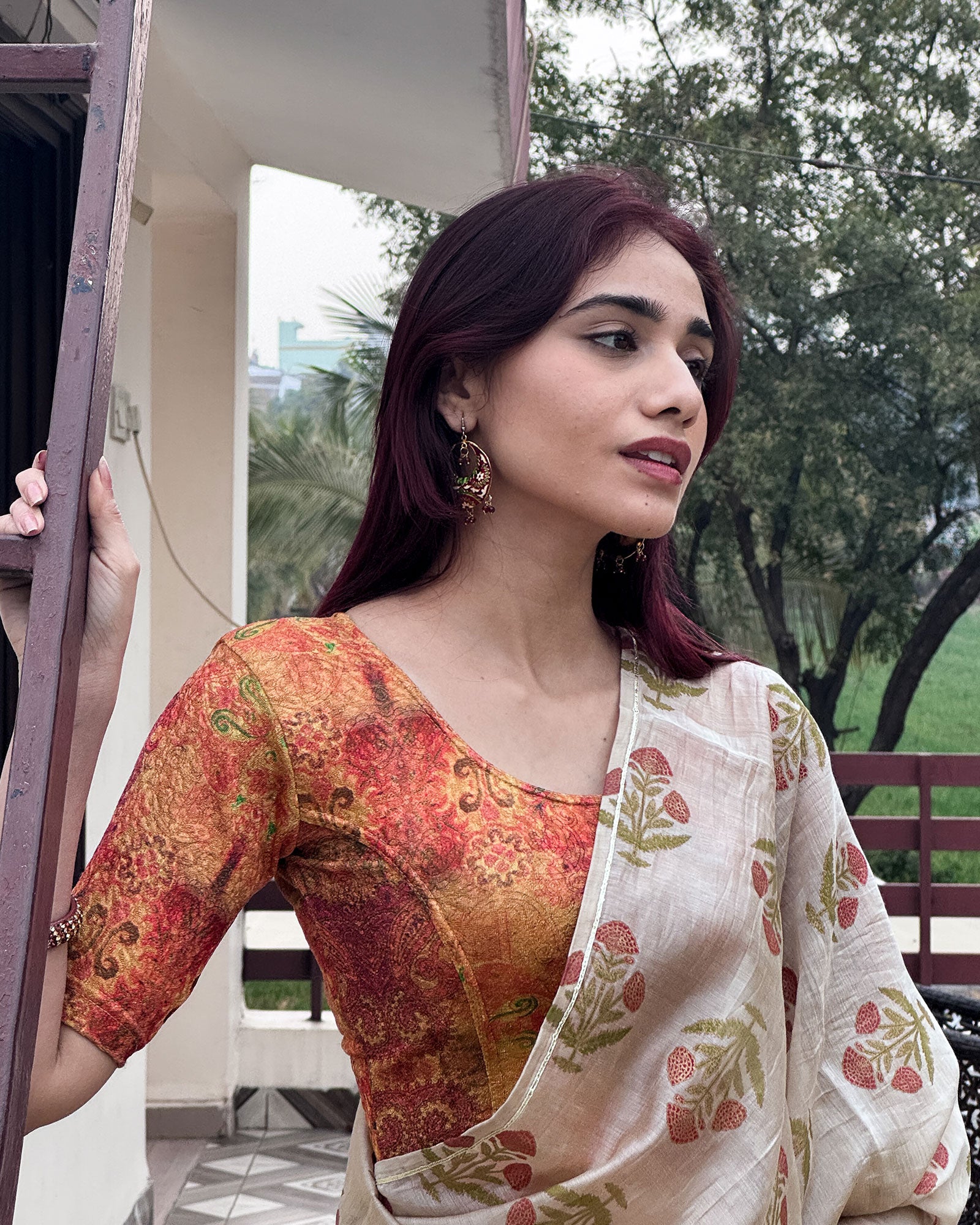 The Baawri blouse is a vibrant yet elegant piece, featuring a multicolour print in a soft Indian palette paired with a striking golden patch at the back. Crafted in a stretchable slip-on silhouette with elbow sleeves, it offers comfort along with a flattering fit. Perfect for pairing with contemporary sarees, traditional silks, or even lehengas, Baawri creates a bold yet refined statement for festive and casual wear alike.