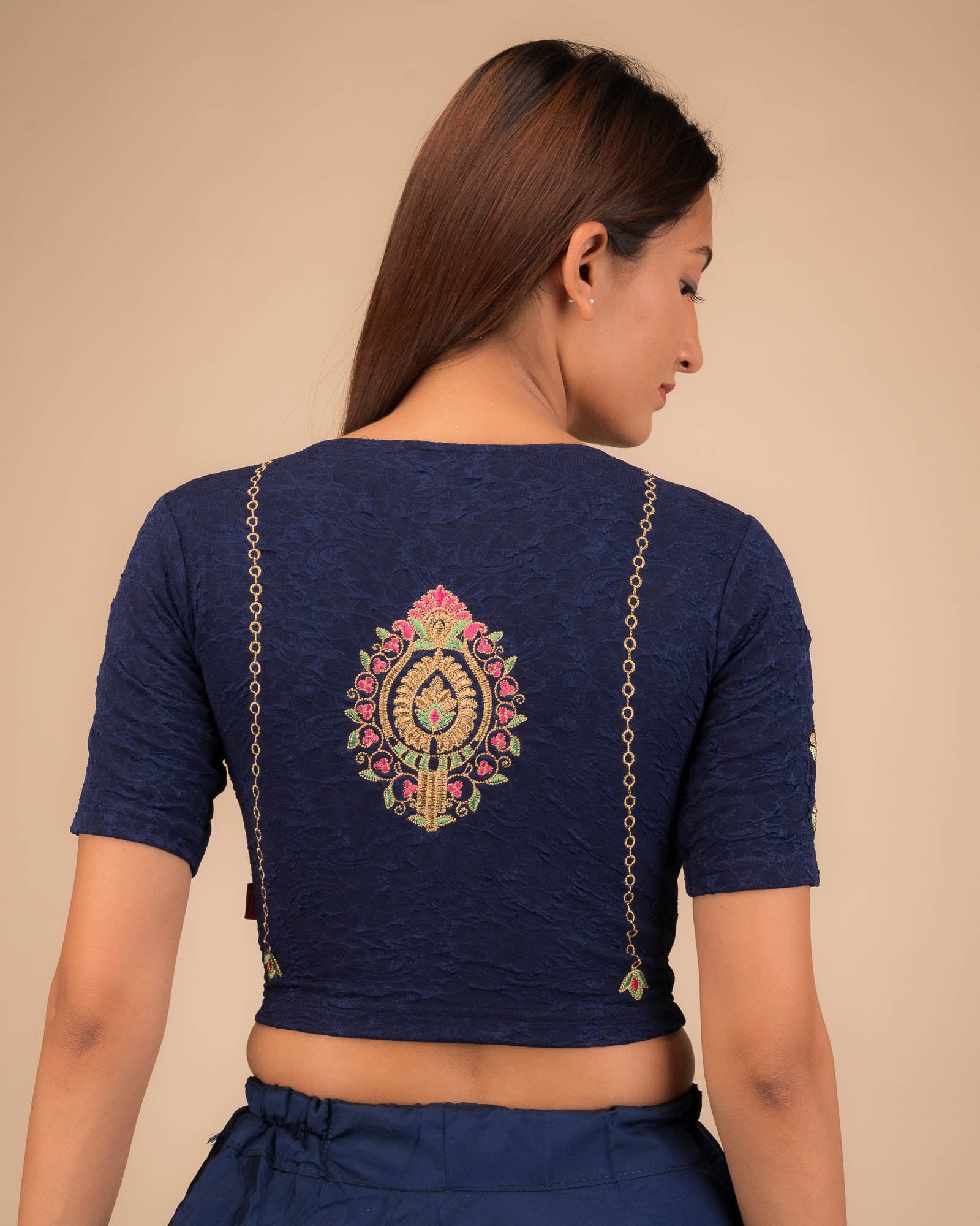An intricate embroidered blouse with butis at back and sleeves. Pairs fantastic with all your heavy sarees and even lehengas!