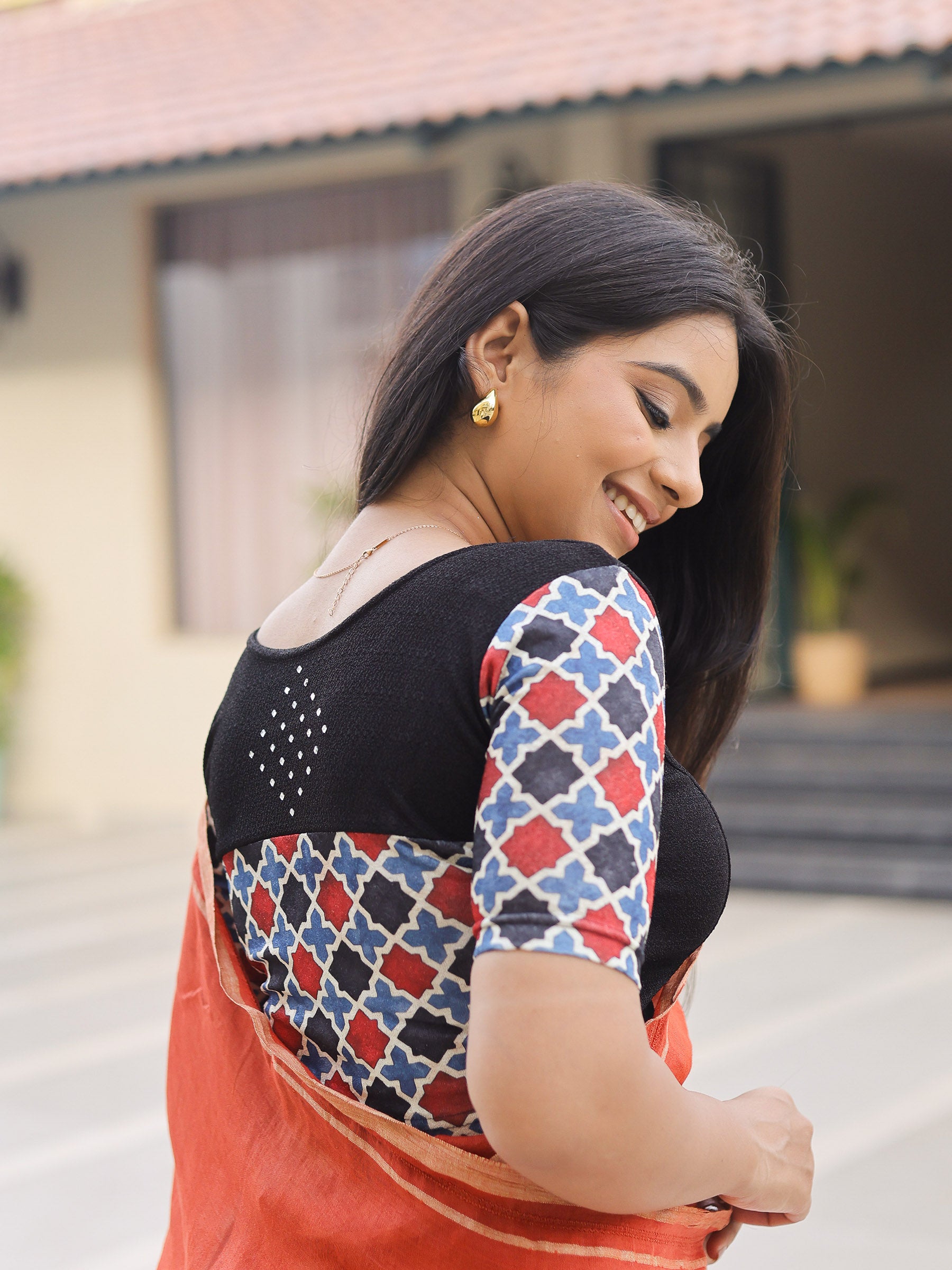 Manek Midnight Black Mirror Ajrakh Saree Blouse – Festive Stretchable by Advi