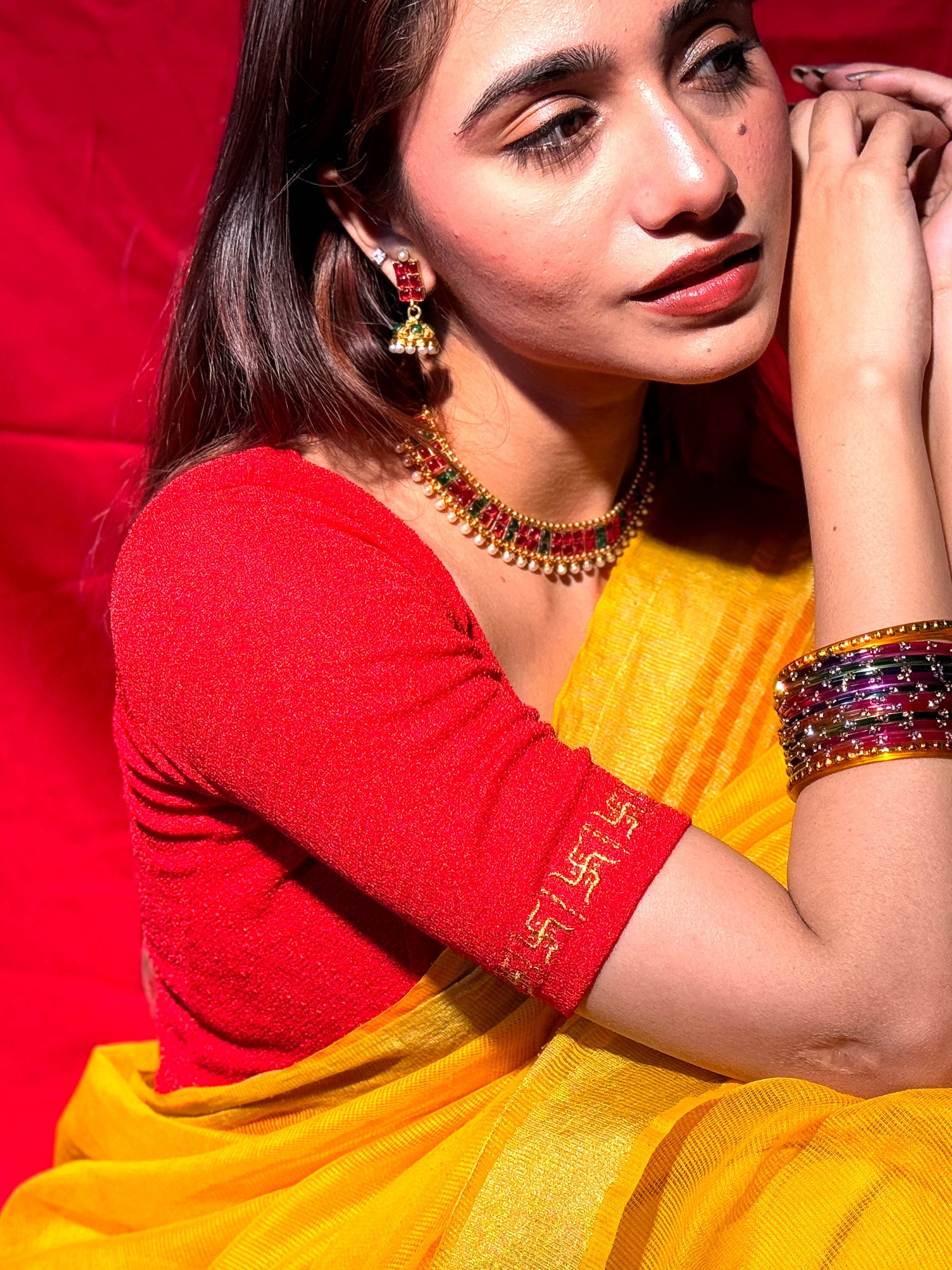 A blouse steeped in tradition and reverence. The vivid red tone, symbolic of prosperity and auspiciousness in Indian culture, makes Mauli an instant heirloom pick. The gold swastika motifs on the sleeves complement zari borders beautifully, allowing it to be worn with gold and silver accented sarees alike. Perfect for temple visits, rituals, and festive gatherings.