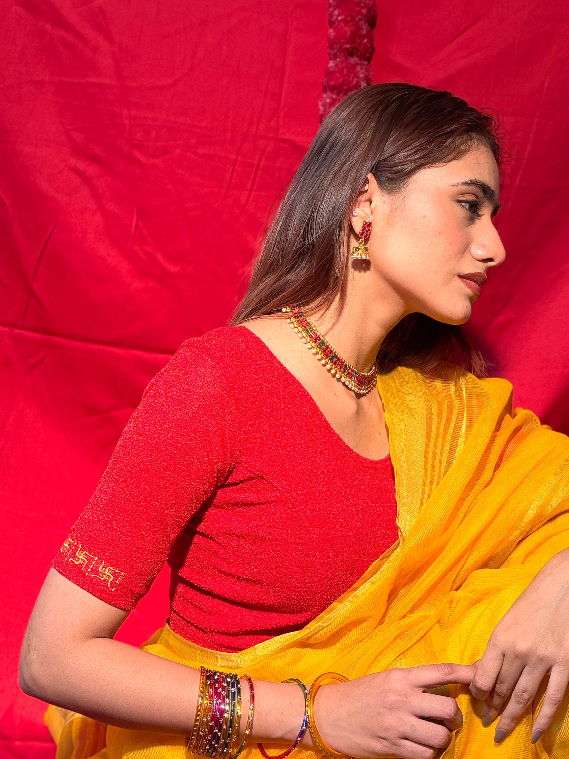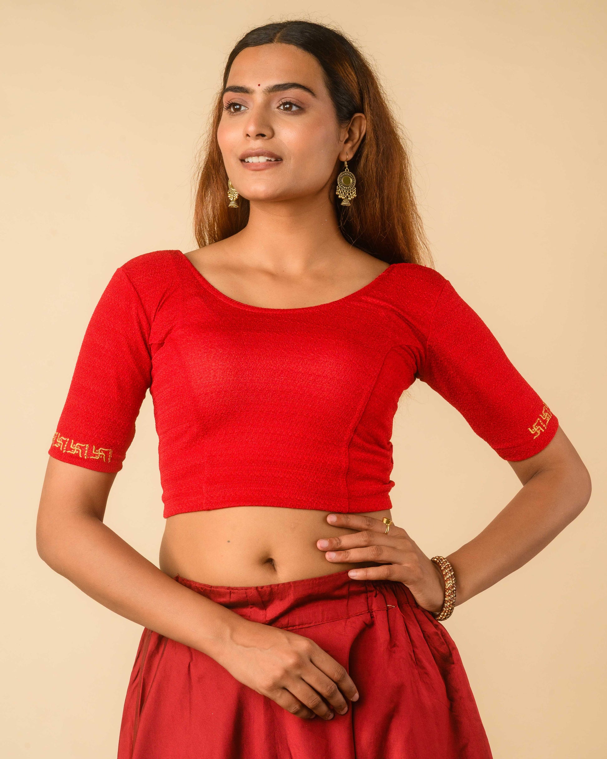 Mauli Red Traditional Swastika Embroidered Stretchable Saree Blouse – Advi