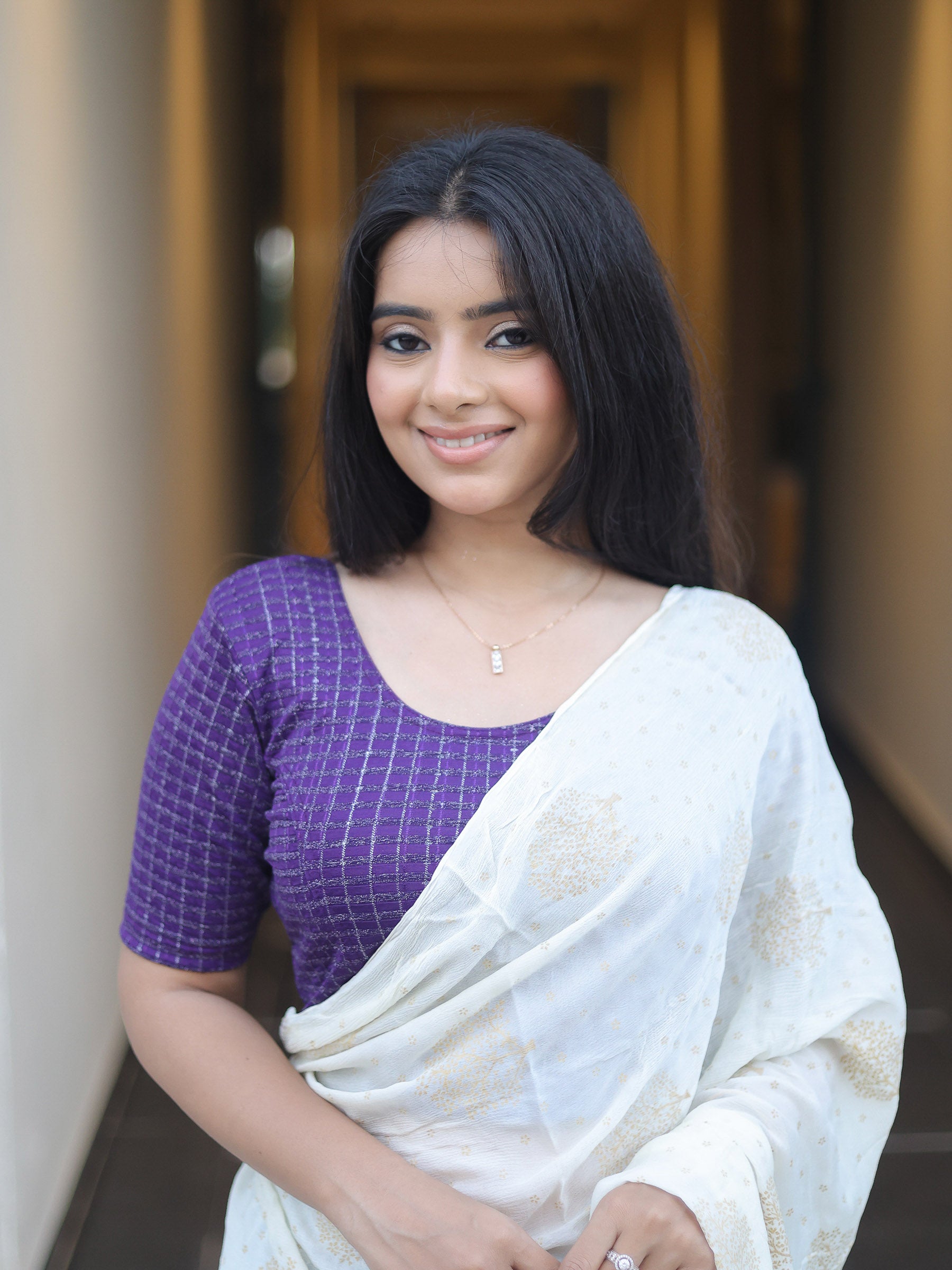 Padmini is a statement festive blouse crafted from soft zari striped jacquard with delicate foil accents forming a subtle checks pattern. The diagonal stripe arrangement at the back creates a flattering illusion, highlighted with handworked buti detailing for an artisanal touch. Designed with a classic round front neck and elbow sleeves, Padmini pairs beautifully with silk sarees, handworked drapes, or festive weaves, ensuring a look that blends tradition with refined elegance.