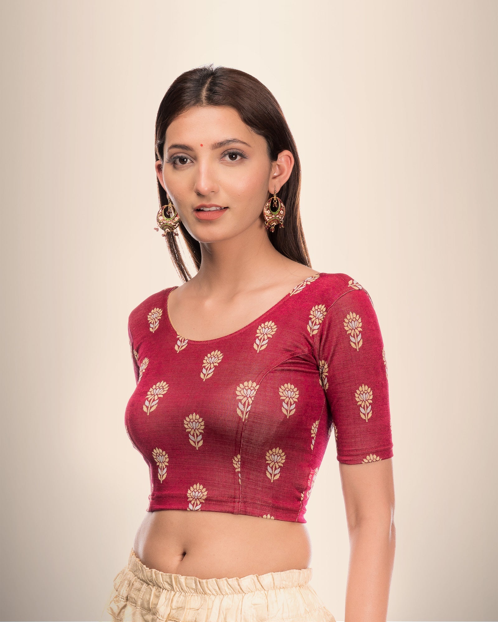 Our all time classic floral fabric in gray & gold color butis, made in a classic round neck style with elbow sleeves. This readymade stretchable blouse comes in bright colors.
