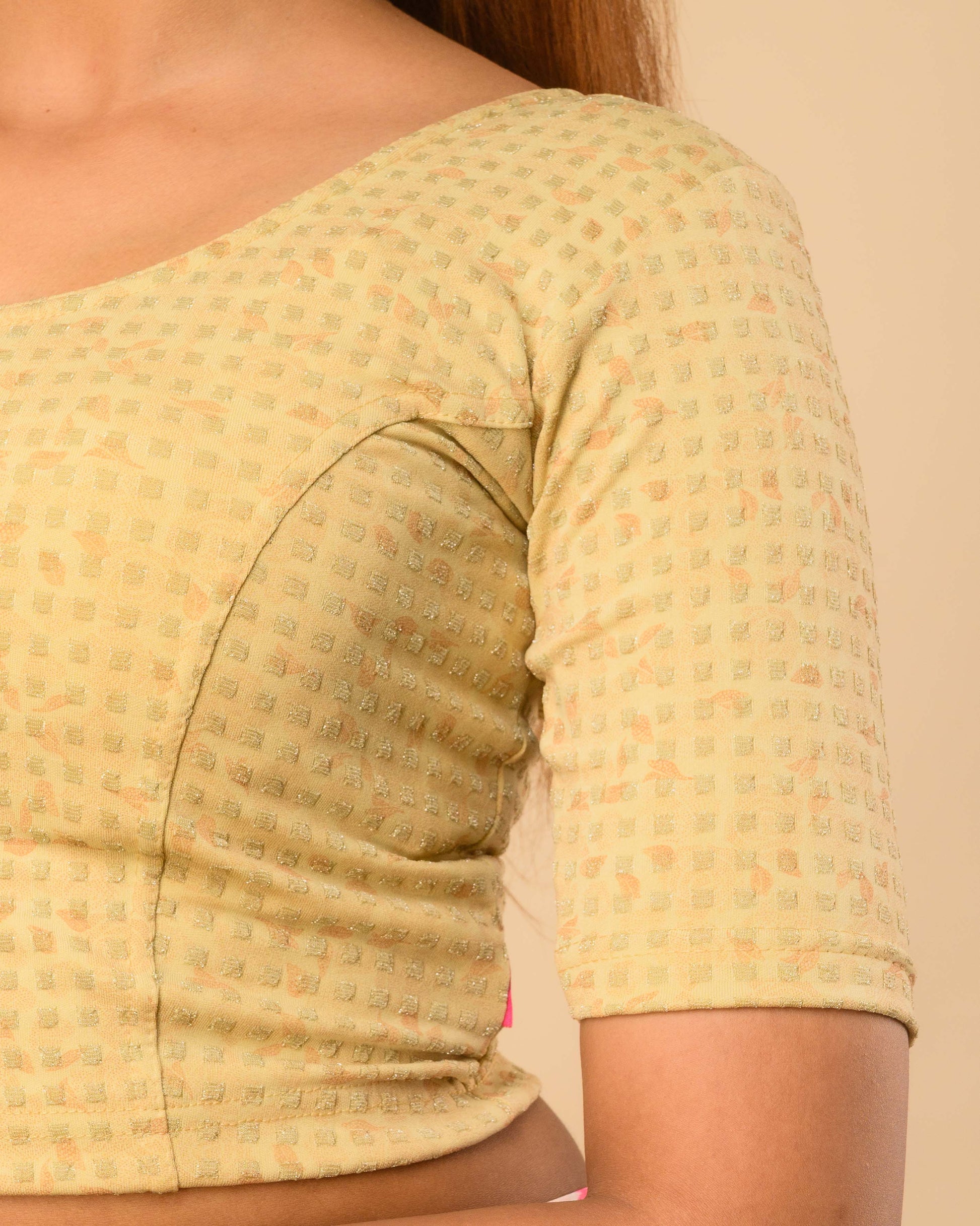 Rutvi brings shimmer and elegance in one easy-to-wear silhouette. Crafted from dobby metallic fabric with delicate ditsy floral and leaf foil prints, this blouse is a celebration of texture and shine. Its stretchable comfort makes it a must-have for festive events, while the basic round neck and elbow sleeves keep it versatile to style. Pair it with silks, satins, embroidered sarees, or even lehengas for a refined, festive look.