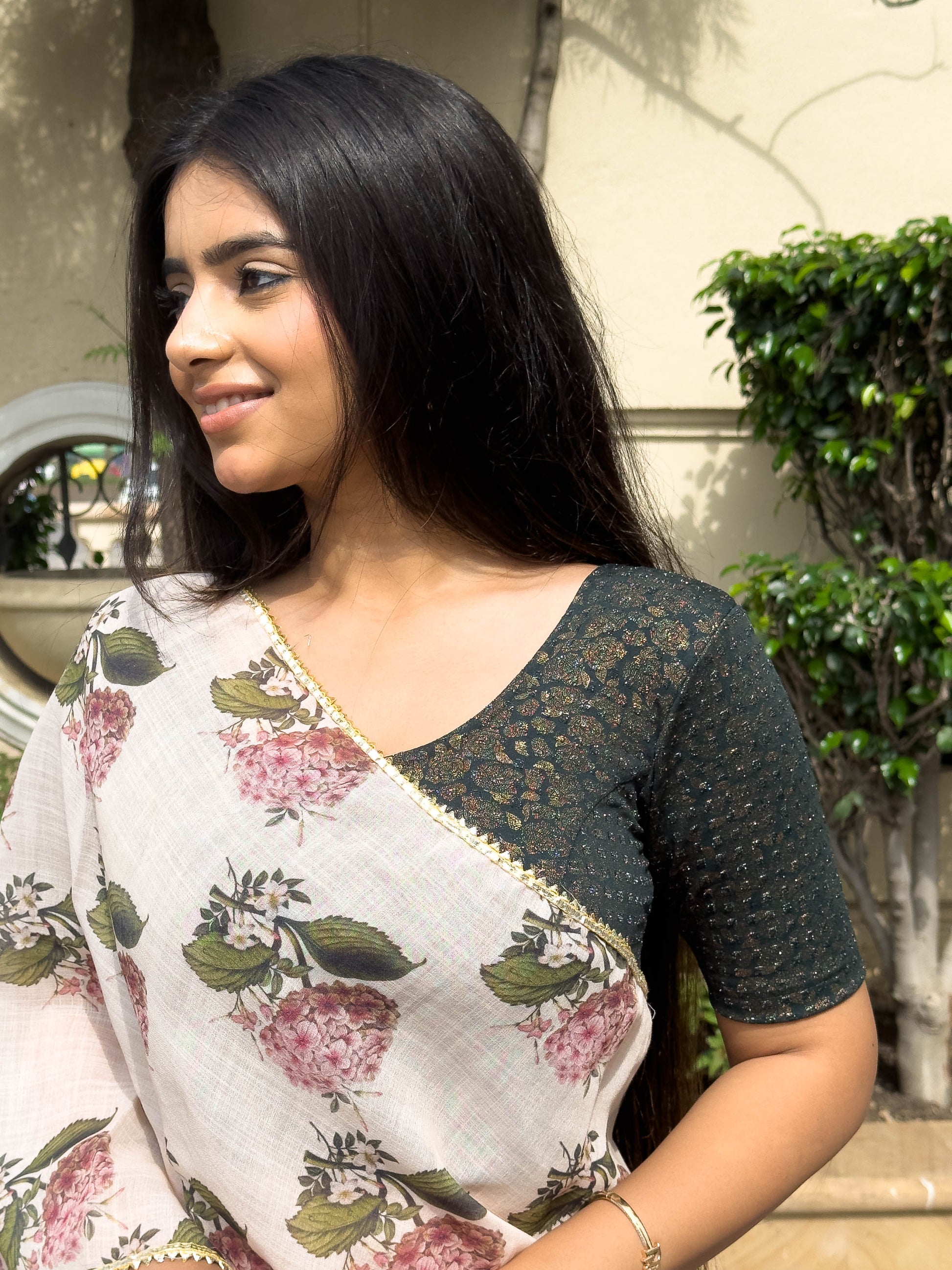 Rutvi brings shimmer and elegance in one easy-to-wear silhouette. Crafted from dobby metallic fabric with delicate ditsy floral and leaf foil prints, this blouse is a celebration of texture and shine. Its stretchable comfort makes it a must-have for festive events, while the basic round neck and elbow sleeves keep it versatile to style. Pair it with silks, satins, embroidered sarees, or even lehengas for a refined, festive look.