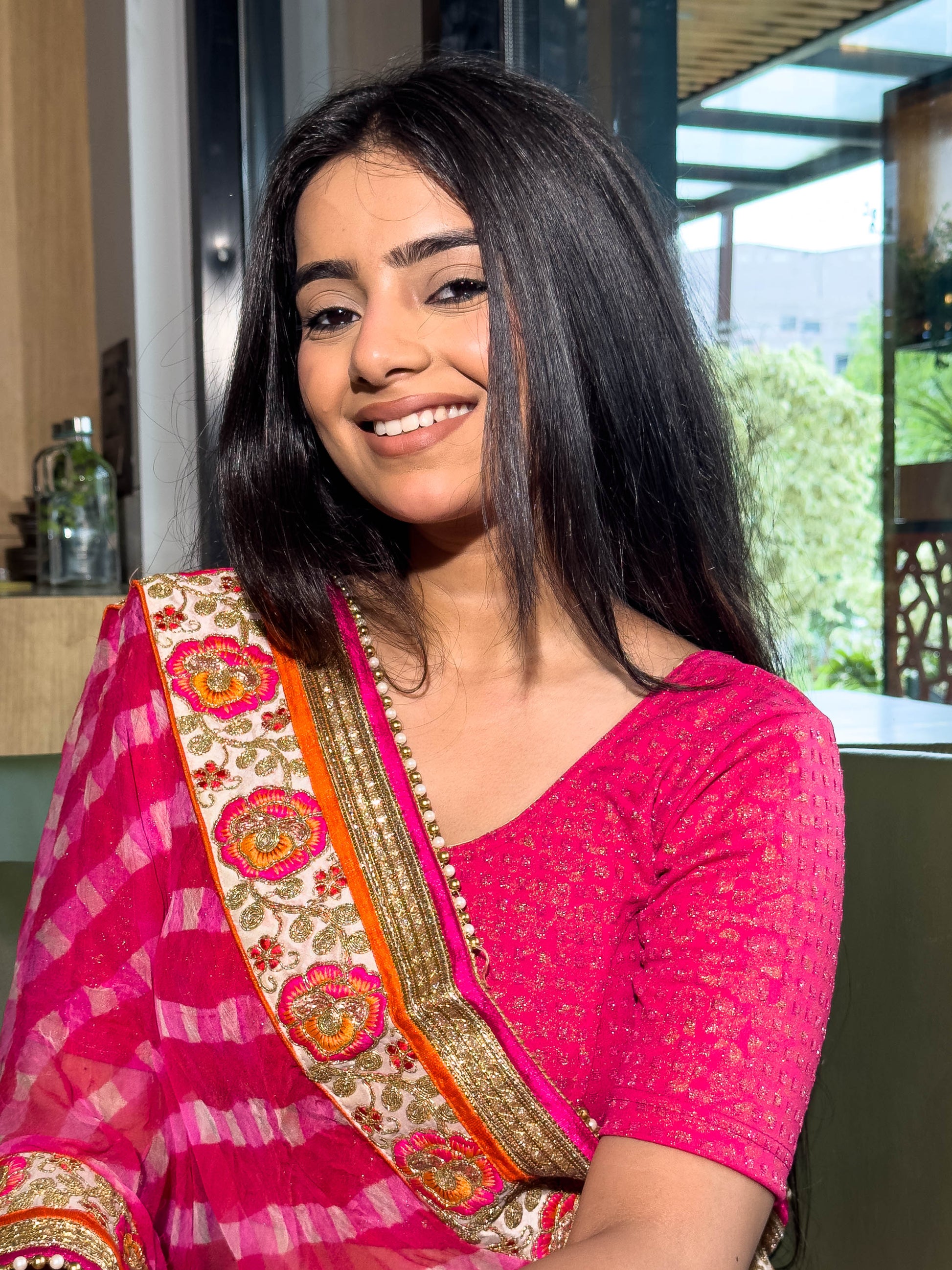 Style Note: Let Rutvi’s shimmer take the spotlight — keep your saree in a rich solid silk or minimal embroidery. Add statement earrings for a striking finish.