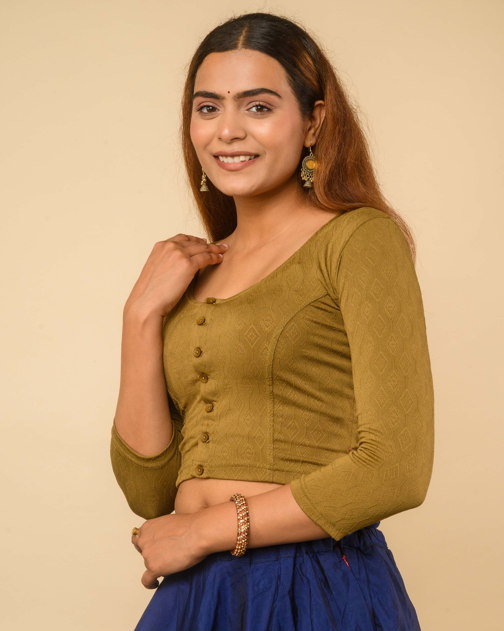 The Sakhi blouse is crafted in a soft jacquard fabric with a delicate self-design texture, offering a breathable and comfortable wear. It features a front button opening for easy dressing, a high back for modest coverage, and long sleeves that make it a go-to for everyday and office wear. Designed to sit comfortably on the body, it’s perfect for pairing with cottons, linens, and light silks.