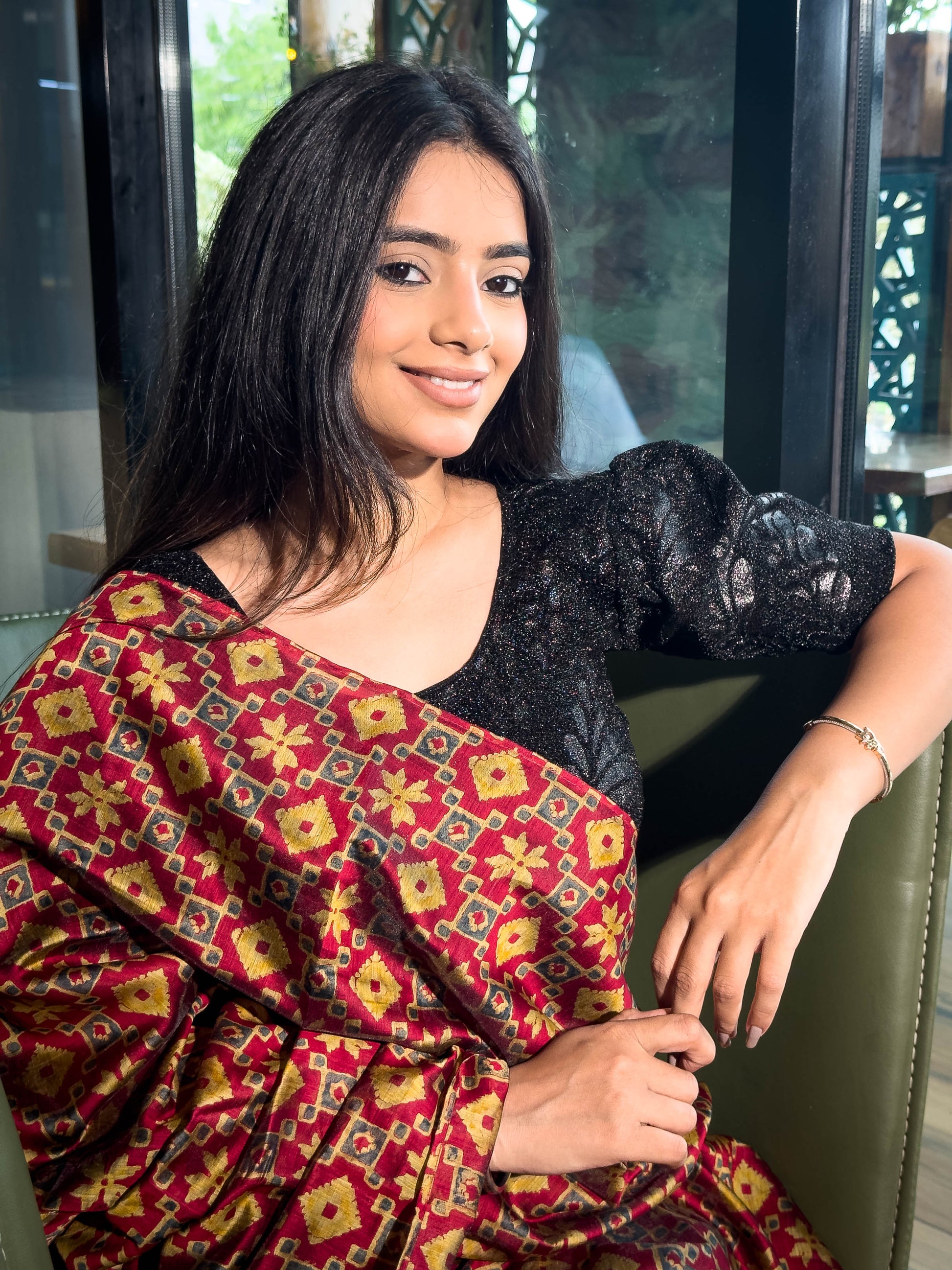 Elevate your saree ensemble with Advi’s Surkh Metallic Zari Blouse. Crafted from luxe stretchable lycra with an intricate metallic zari emboss design, this blouse features subtle bling balanced with elegance. Designed with a round neckline and elbow-length sleeves, it offers a comfortable slip-on fit ideal for festive occasions, weddings, or partywear.